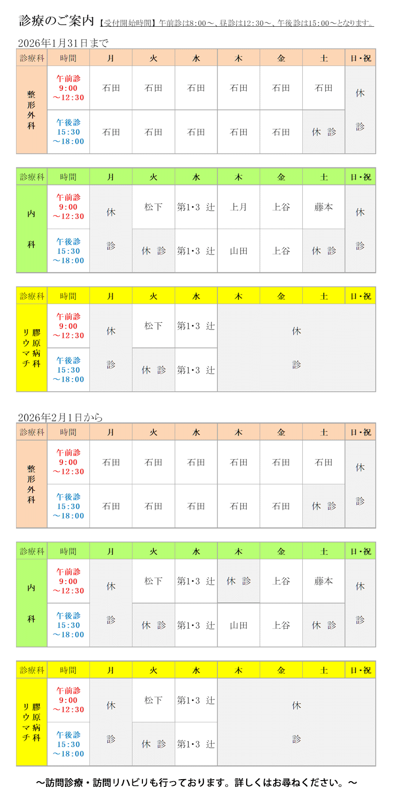 10月1日より膠原病・リウマチ科医師 松下正人医師・毎週火曜日午前診のみ 辻知宗医師・第1・3水曜日終日診療となります。